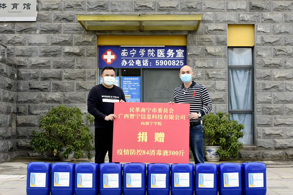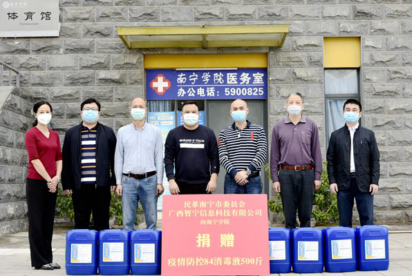 在此次受捐到民革南宁市委员会及广西智宁信息科技有限公司捐出的84消毒液500斤,南宁汉和生物科技股份有限公司及广西明泰承投资有限公司捐出的84消毒液1吨。捐赠仪式上,龚副校长代表学校向各捐赠单位的无私捐赠、爱心善举表示由衷感谢,感谢对学校防疫工作的大力支持。