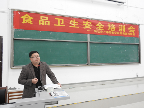 后勤保障与基建管理处付晓强副处长在主持培训会时强调了食品安全的重要性,以及忽视食品安全卫生的严重后果,要求膳食管理人员及全体从业人员要重视这次食品安全培训,通过这次培训学习到如何识别食品生产中的安全风险源并进行有效控制,杜绝食品安全问题的出现。