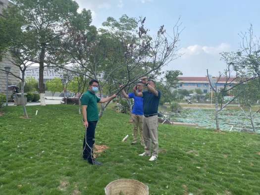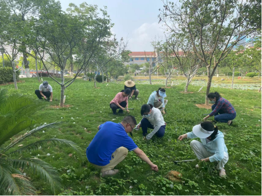 同志们认真除草,用手拔除较细较小的幼草,用小锄头连根除去枝干教粗的长杆杂草,用剪刀修剪枯萎的树枝、树叶