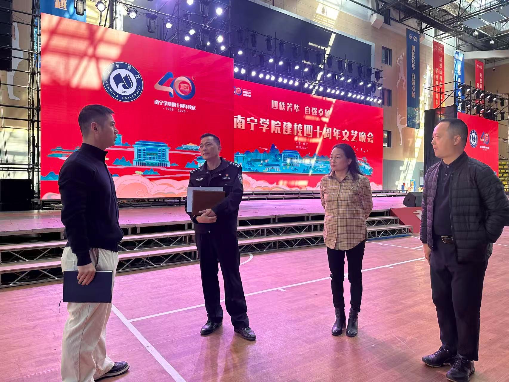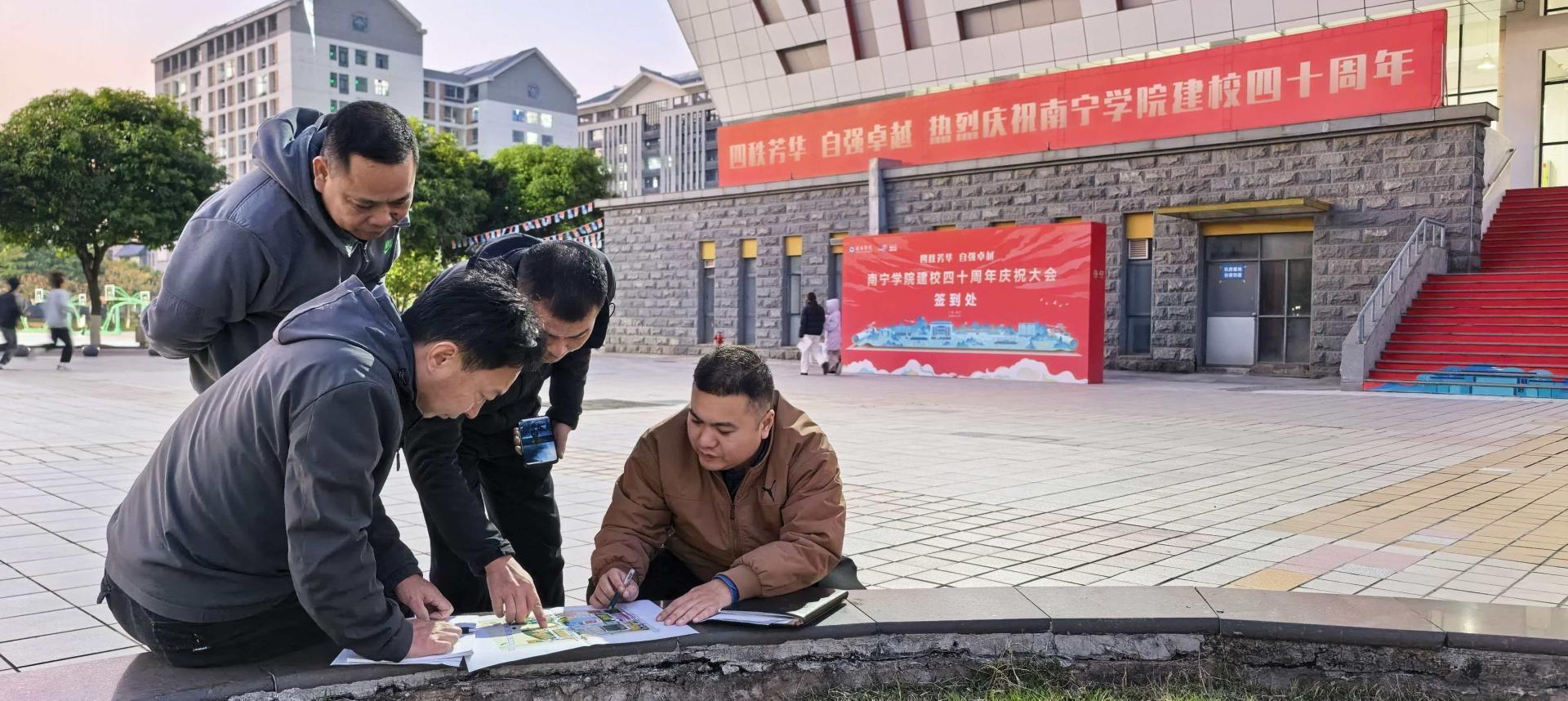 四秩芳华启新程,后勤保障显担当。学校40周年校庆临近,后勤保障与基建管理处(下简称:后基处)以“服务育人”为核心,锚定“零差错、零疏漏”目标全力冲刺。邕宁区政法部门领导带队入校,与校领导联合巡查核心区域研判风险;后基处召开工作推进会细化分工,联动公安、交警等部门凝聚协同保障合力。
